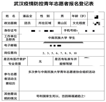恰逢武汉发布了疫情防控青年志愿者招募令,潘品全同学义无反顾,立即报名,最终顺利通过审核,成为武汉市抗疫青年志愿者一员。这个曾参军入伍两年的年轻人在他的疫情防控报名表上写下一句振奋人心的话:苟利国家生死以,岂因祸福避趋之!