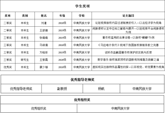 9月24日,国家版权局公示了第十三届全国大学生版权征文获奖名单,我校法学院师生在此次征文活动中取得了亮眼的成绩,获奖人数创新高,共有1名研究生和6名本科生获奖,分别为:
