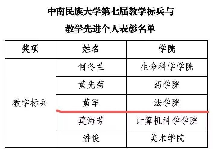 在第40个教师节来临之际,经学院推荐、学校教学工作委员会评议、教学奖励工作小组审议等程序,我校公布“中南民族大学第七届教学标兵与教学先进个人”表彰名单。本次共评选出教学标兵5名、教学先进个人9名,法学院黄军副教授荣获“教学标兵”称号。